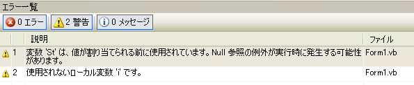 大き目のプログラムになると、この一覧を見ながらエラーや警告を減らしていくことを目標にプログラムしていくという場合もあります。