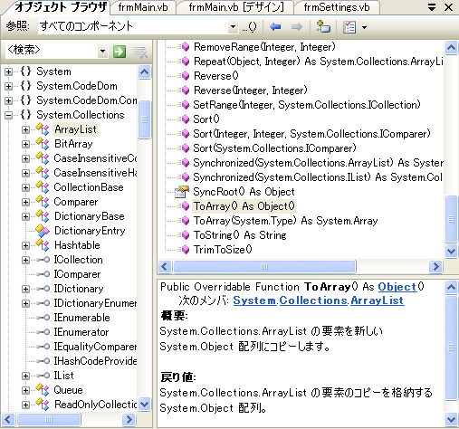 ■画像5:オブジェクトブラウザでSystem.Collections.ArrayList.ToArrayメソッドの情報を表示したところ。