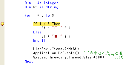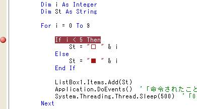 今度はブレークポイントを使ってみましょう。ブレークポイントは実行を停止させたい個所を自分で指定する機能です。If i < 5 Thenの行で停止させて見ます。この行の左の部分をクリックしてください。言葉で「左の部分」と言ってもわかりにくいと思います。もし、わからない場合はこの行にカーソルを移動して[F9]を押してください。クリックでも[F9]でもどちらでも ブレークポイントを設定することが出来ます。ブレークポイントは茶色い丸として表示されます。
