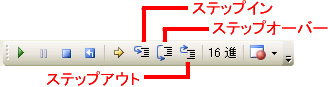 ステップイン、ステップオーバー、ステップアウトは状況により使い分けます。また途中まではステップオーバーで実行して、途中からはステップインで実行するなど1行ごとに使い分けることも可能です。ツールバーのボタンをボタンをクリックすることで好きな方法でステップ実行を行うことができます。このツールバーはデバッグツールバーです。表示されていない場合は[表示]メニューの[ツールバー] - [デバッグ]で表示させることができます。