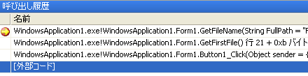 この行で実行が停止します。このときに[デバッグ]メニューの[ウィンドウ] - [呼び出し履歴]をクリックして呼び出し履歴ウィンドウを表示すると次のようになっています。