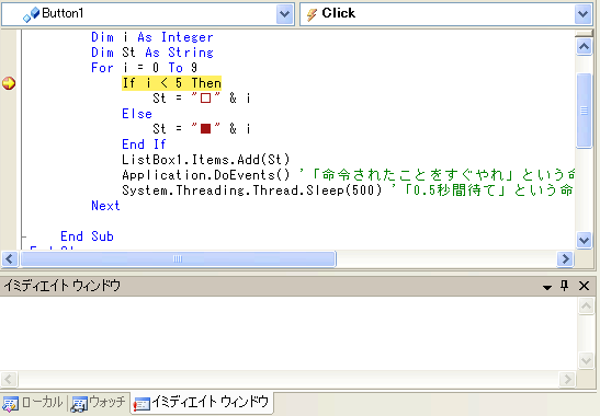 一緒にやってみましょう。先ほどのリスト1のプログラムでIf i < 5 Thenの行にブレークポイントを設定して実行してください。すぐにブレークポイントで実行が停止します。この状態でイミディエイトウィンドウを表示してください。