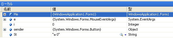 今度はローカルウィンドウというものを使ってみます。リスト1のプログラムを用意してください。そして、さきほど説明したように実行を停止し、この状態で[デバッグ]メニューの[ウィンドウ] - [ローカル]をクリックしてください。次の画像にあるウィンドウが表示されます。