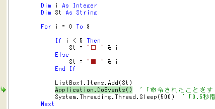 なお、Application.DoEventsは今回はなくても良いのですが、表示が更新されないと気持ち悪いので入れました。どういうことかというと普段はプログラムが一瞬で実行されるので気になりませんが、実は表示に関する多くの命令はプログラムが命令した瞬間に表示が更新されるわけではなく、実行がEnd Subにたどり着くなど一息つけるところに来てから実際の表示更新が行われるのです。