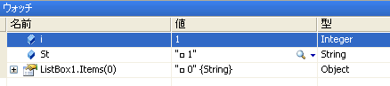 ウォッチウィンドウにははじめは何も表示されていないので自分で見たい変数を指定します。名前欄に直接iとかStとか入力することもできますが、プログラム画面から変数をドロップして追加することもできてこちらの方が楽です。上の画像ではiとStをドロップして追加し、ListBox1.Items(0)を直接入力して追加しました。