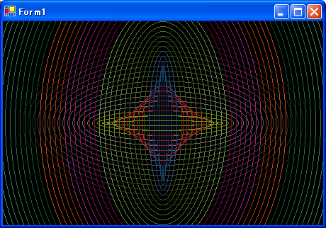 実はKの値が大きくなっていくとだんだんと座標がマイナスになっていくので、途中から円が反転してしまうのです。それで反転した円と普通の円が無数に交差して不思議な文様になるわけです。(フォームのクライアント領域が丁度正方形の場合はこのような文様は出現しません。)
