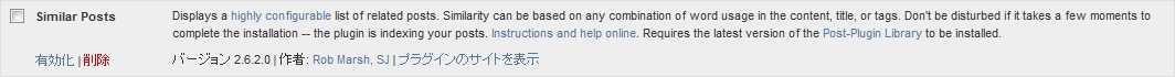 管理パネルで、「プラグイン」をクリックし、プラグイン設定画面を開く。「 Similar Posts 」を探し有効化。