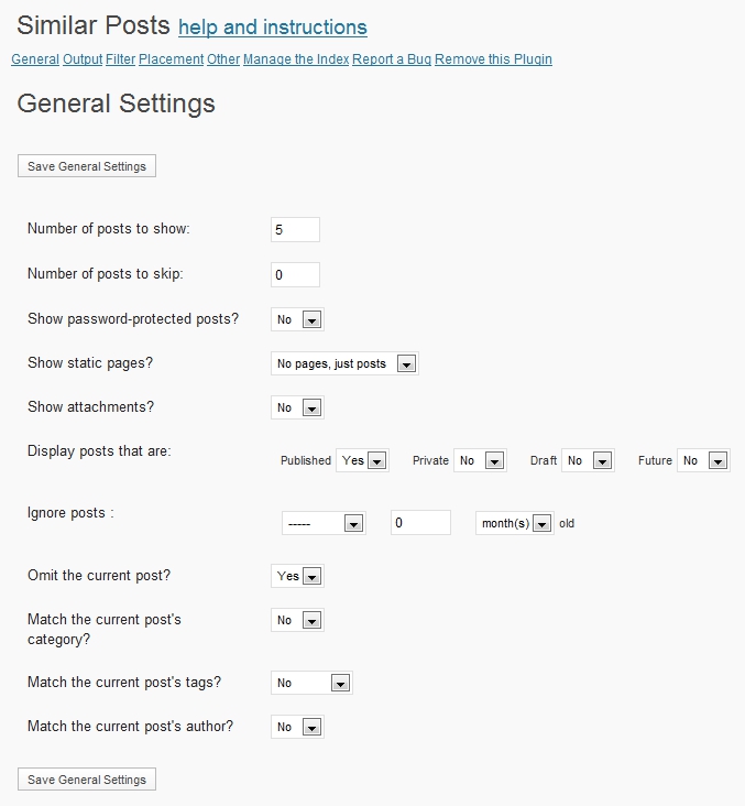 管理パネルで、「設定」の横の▽をクリックすると、右の画像のように、「 Similar Posts 」が追加されている。「 Similar Posts 」をクリックすると、まず、「General Settings」が現れる。