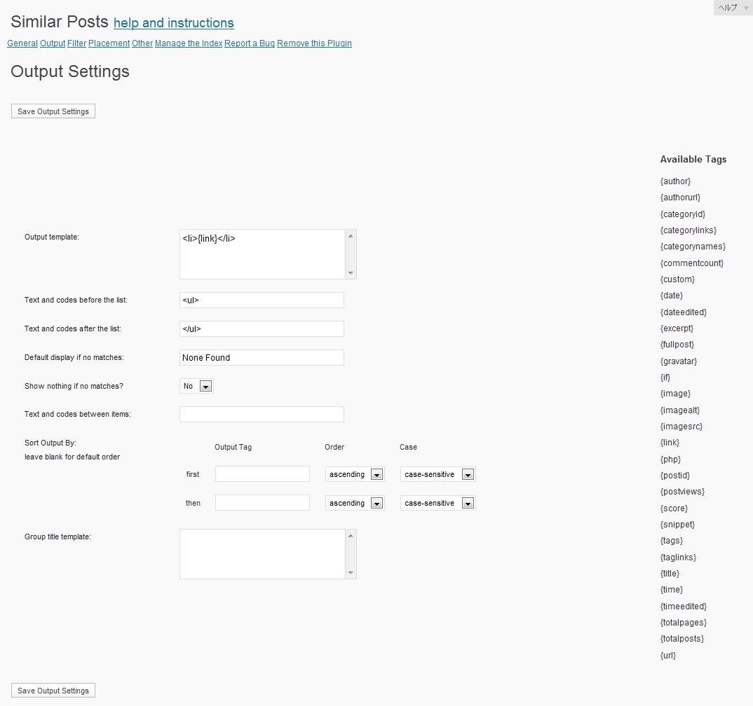 「 Output Settings 」でリスト表示をカスタマイズできる。利用可能なタグが右側に表示されている。例えば、カテゴリ名を表示させたければ、{categorynames} を使えばいい。