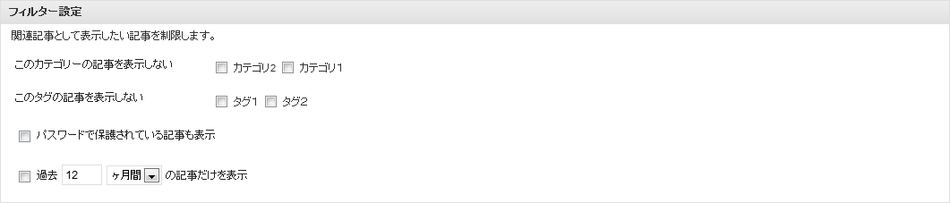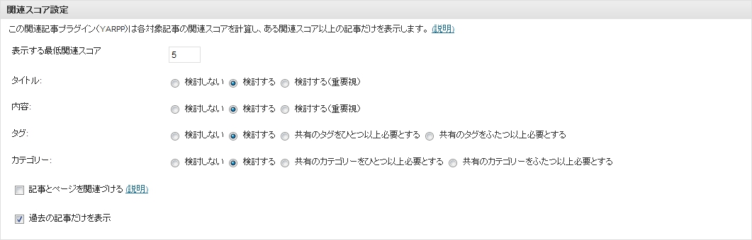 「 Yet Another Related Posts Plugin 」は、対象記事の関連スコアを計算する。関連スコア設定で、計算する際の重要度をある程度設定できる。表示する最低関連スコアも設定できる。