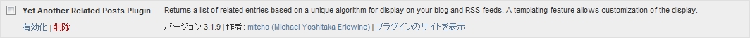 管理パネルで、「プラグイン」をクリックし、プラグイン設定画面を開く。「Yet Another Related Posts Plugin」を探し有効化。