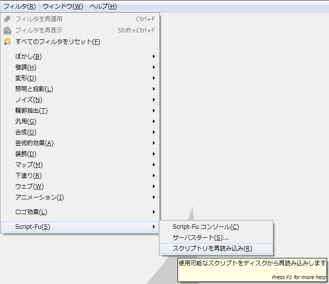 「 フィルタ > Script-Fu > スクリプトを再読み込み 」をクリック。