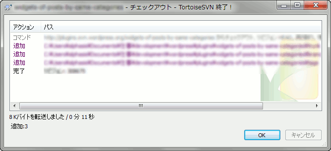 しばらくすると、右の画像のように「コピー 窶・TortoiseSVN 終了!」となる。