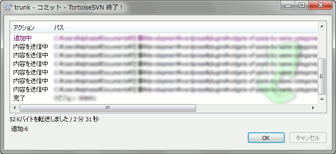 しばらくすると、右の画像のように「trunk – コミット – TortoiseSVN 終了!」となる。