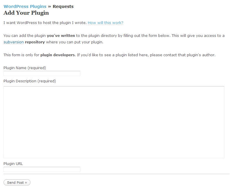 ログインした状態で、Add Your Pluginを開くと、右のスクリーンショットのような、プラグイン登録申請フォームが現れる。