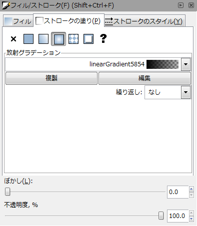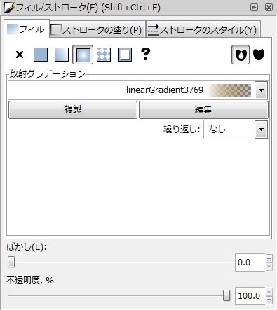 メニューバーの「 オブジェト -> フィル/ストローク 」、もしくは、「 Shift + Ctrl + F 」で、「フィル/ストローク」のダイアログを開く。