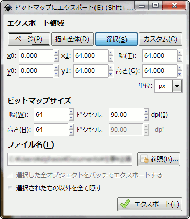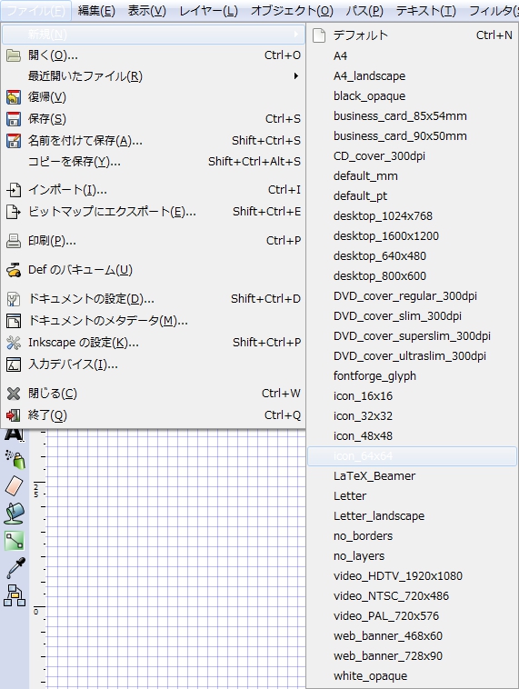 メニューバーの「 ファイル -> 新規 -> icon_64x64 」で、64px × 64px のファイルを新規作成。