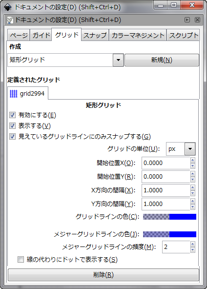 「グリッド」タブを開く。「矩形グリッド」を選択し、「新規」をクリック。「メジャーグリッドラインの頻度:」を、「2」に設定し、2px ごとにメジャーグリッドラインを表示させる。