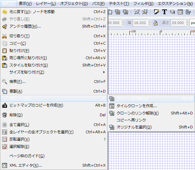 メニューバーの「 編集 -> クローン -> クローンを作成 」、もしくは、「 Alt + D 」で、クローンを作成する。