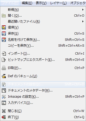 グリッドを表示させておくと便利。メニューバーの「 ファイル -> ドキュメントの設定 」で、「ドキュメントの設定」ウィンドウを開く。キーボードで「 Shift + Ctrl + D 」を同時に押しても、「ドキュメントの設定」ウィンドウを開くことができる。