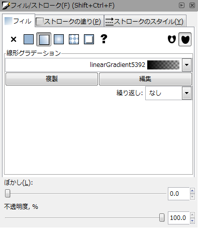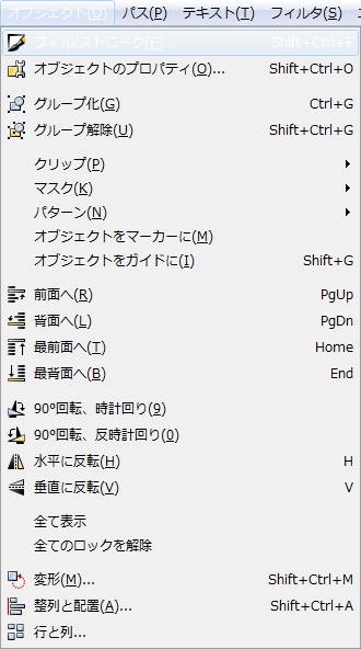 メニューバーの「 オブジェト -> フィル/ストローク 」、もしくは、「 Shift + Ctrl + F 」で、「フィル/ストローク」のダイアログを開く。