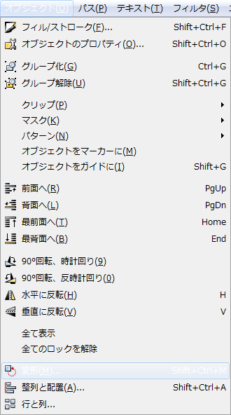 メニューバーの「 オブジェト -> 変形 」で、変形ダイアログを開く。