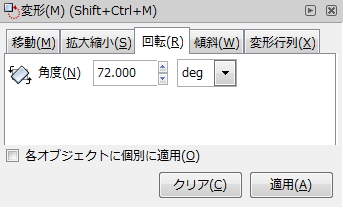 回転タブを開き、角度を「72」を設定し、「適用」ボタンをクリック。