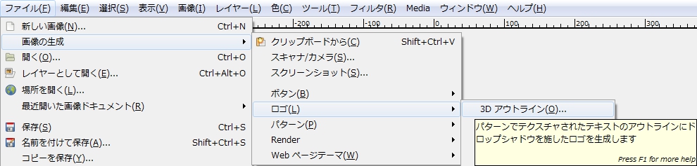 メニューバーの「 ファイル > 画像生成 > ロゴ > 3D アウトライン 」で、「 Script-Fu: 3D アウトライン 」ダイアログを開く。