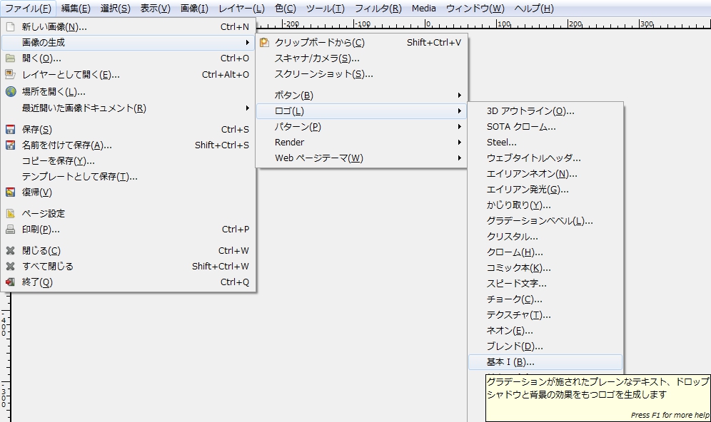 メニューバーの「 ファイル > 画像生成 > ロゴ > 基本 Ⅰ 」で、「 Script-Fu: 基本 Ⅰ 」ダイアログを開く。