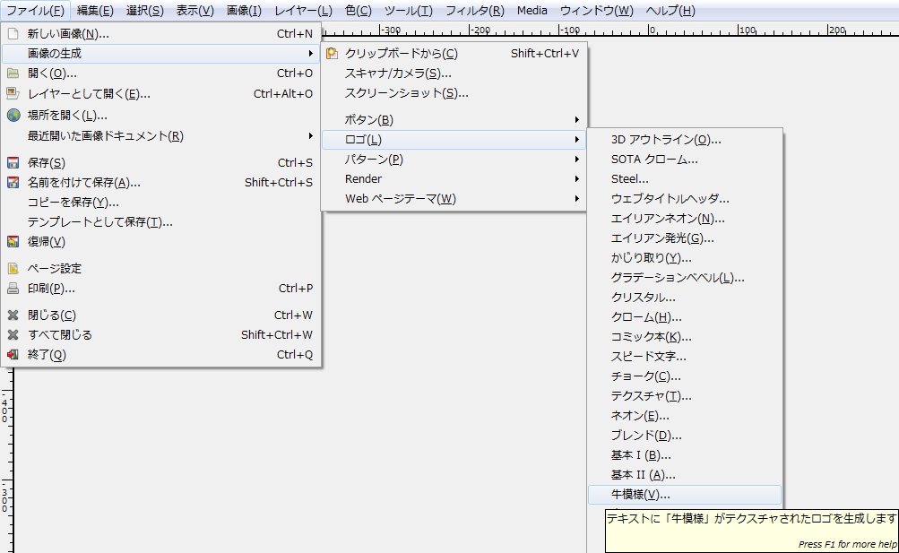 メニューバーの「 フィルタ > ロゴ効果 > 牛模様 」で、「 Script-Fu: 牛模様 」ダイアログを開く。