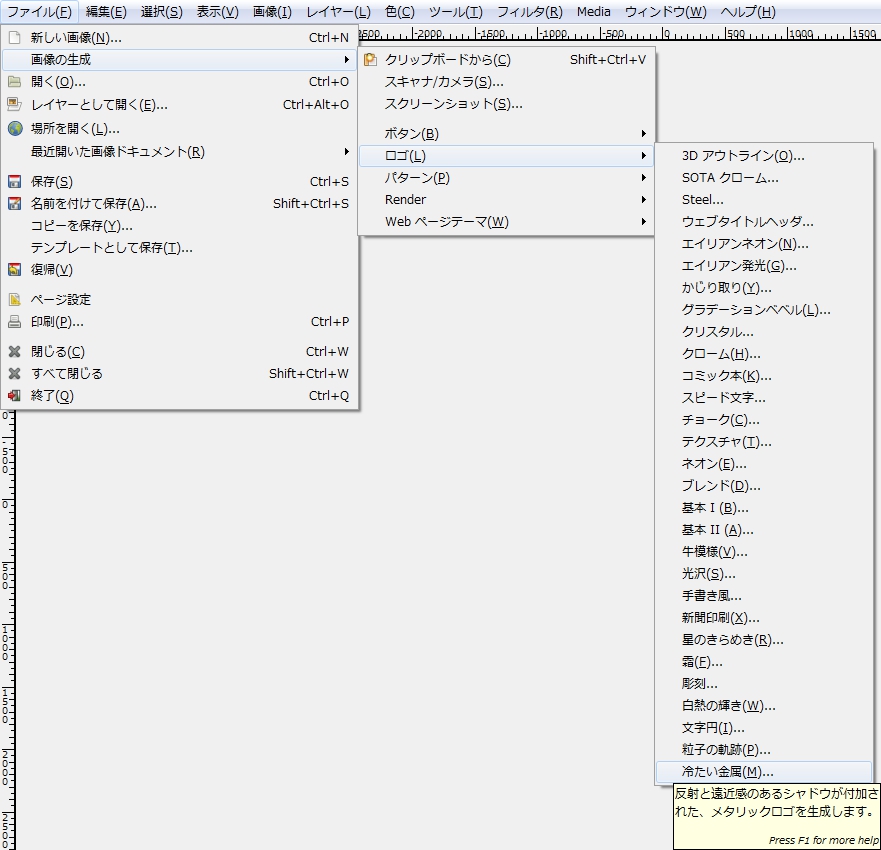 メニューバーの「 ファイル > 画像生成 > ロゴ > 冷たい金属 」で、「 Script-Fu: 冷たい金属 」ダイアログを開く。