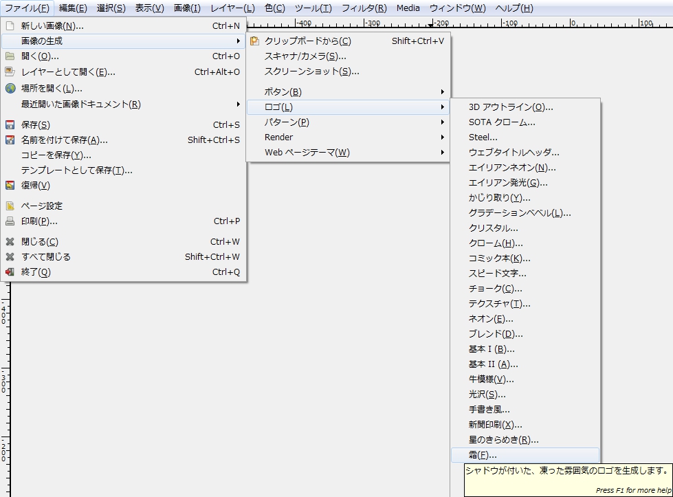 メニューバーの「 ファイル > 画像生成 > ロゴ > 霜 」で、「 Script-Fu: 霜 」ダイアログを開く。
