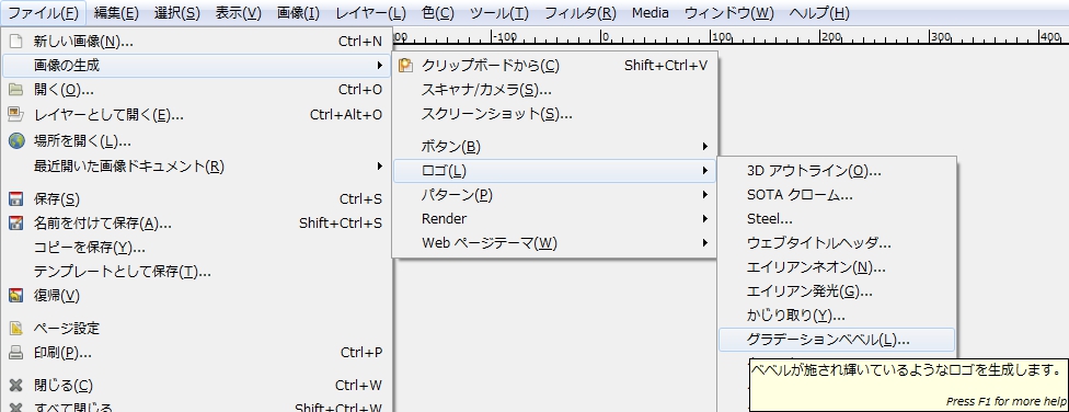 メニューバーの「 ファイル > 画像生成 > ロゴ > グラデーションベベル 」で、「 Script-Fu: グラデーションベベル 」ダイアログを開く。