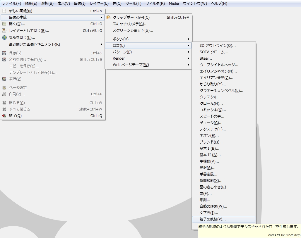 メニューバーの「 ファイル > 画像生成 > ロゴ > 粒子の軌跡 」で、「 Script-Fu: 粒子の軌跡 」ダイアログを開く。