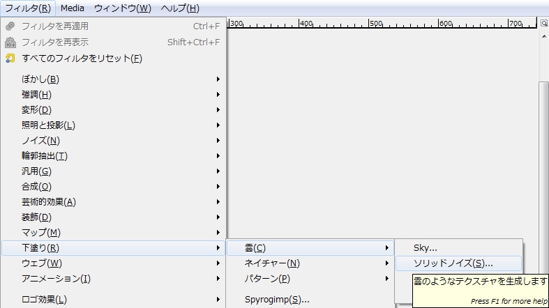 メニューバーの「 フィルター >下塗り > 雲 > ソリッドノイズ 」で、「 ソリッドノイズ 」ダイアログを開く。