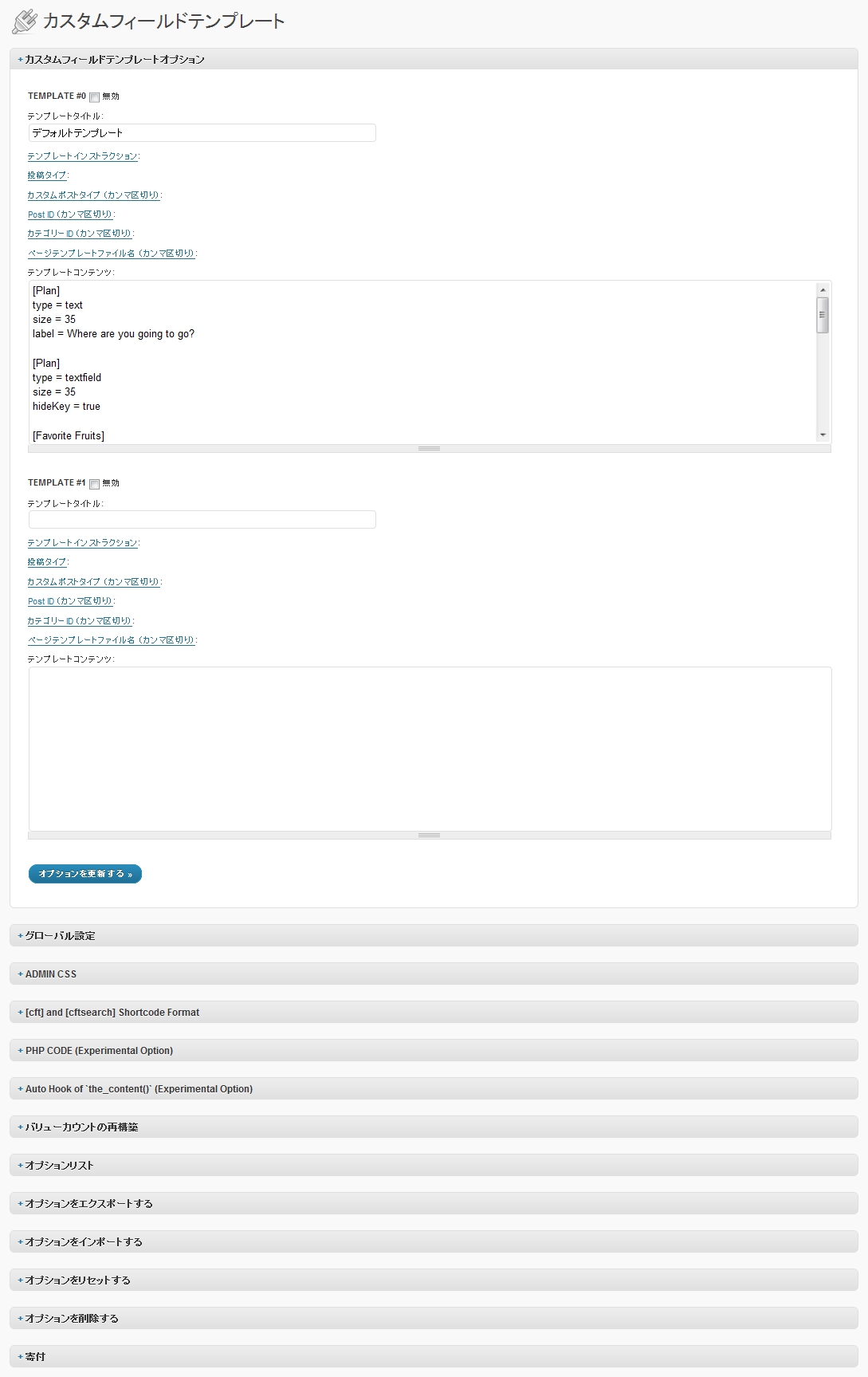 右の画像のように、設定項目がずらりと並んでいるが、「カスタムフィールドテンプレートオプション」と「 [cft] and [cftsearch] Shortcode Format 」を設定するだけでも、大概のことはできてしまうだろう。