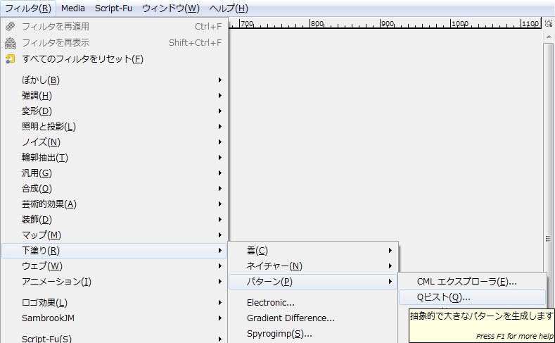 GIMPのメニューバーの「 フィルタ ≫ 下塗り ≫ パターン ≫ Qビスト 」のスクリーンショット。