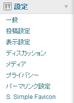 管理パネルで、「設定」の横の▽をクリックすると、右の画像のように、「 S. Simple Favicon 」が追加されている。「 S. Simple Favicon 」をクリックすると、Shockingly Simple Favicon の設定画面が現れる。