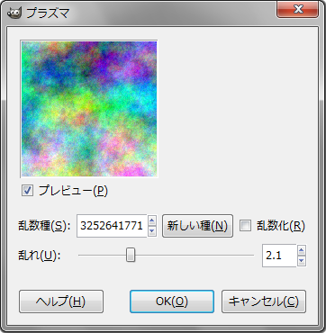 GIMPの「プラズマ 」フィルタのダイアログのスクリーンショット。