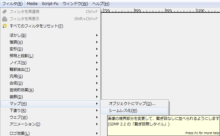GIMPのマップフィルタ「シームレス化」の開き方。