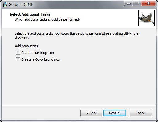 クイック起動ツールバーにGIMPのショートカットを作りたい場合は、「 Create a Quick Launch icon 」にチェックを入れる。