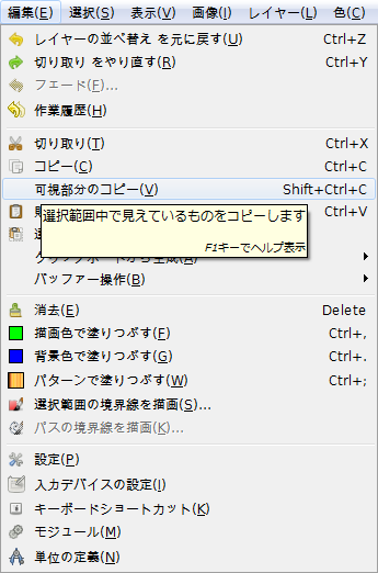 GIMPの「編集」メニュー内に、「可視部分のコピー」はある。