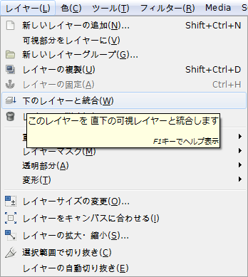 GIMPの「レイヤー」メニュー内に、「下のレイヤーと統合」はある。