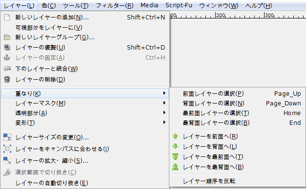 GIMPの「レイヤー」メニュー内に、「重なり」はある。