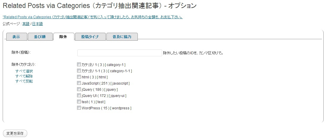 ‘除外’のタブをクリックすると、除外したい投稿、カテゴリなどを選択できるオプションが現れる。