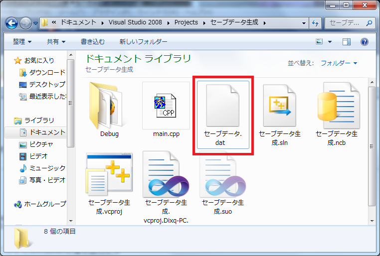 プログラムを実行すると、「セーブデータ.dat」という何にも関連付けされていないファイルが生成されます。