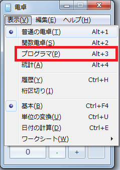 実は「表示」をクリックするとプログラマー用の電卓に変更できます。
