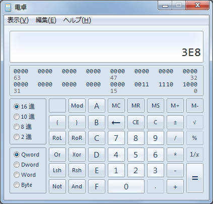 「00 00 03 E8」が10進数でいくつになるか確認したいので、「16 進」にチェックを入れ、「3E8」と入力