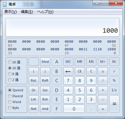 その後「10 進」にチェックを移すと 10 進数でいくつになるかが分かります。