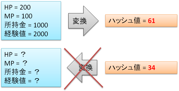 また、セーブデータからはハッシュ値が計算出来ましたが、ハッシュ値からはセーブデータを計算することができません。